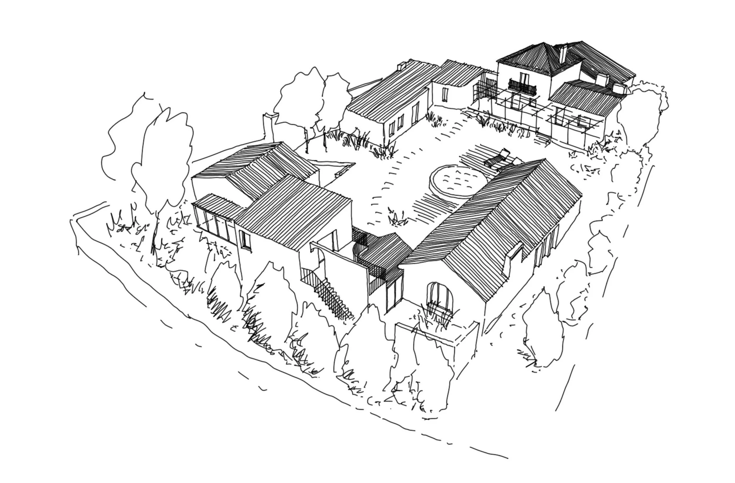 Da antiga casa foi preservada um volume em forma de “L” e criado um segundo, também ele em forma de “L”, por forma a oferecerem uma maior integração das áreas sociais com a zona de quartos. Entre ambos foi criado um jardim introspetivo, ao ar livre. O novo corpo da casa, composto por três volumes brancos, está elegantemente conectado por uma pérgula. A nova construção segue a diversidade formal caraterística das edificações vernaculares que evoluem ao longo do tempo, harmonizando-se com a pré-existência. Os materiais naturais como reboco tradicional e pavimentos em pedra e carvalho, aliados às janelas de madeira, preservam a linguagem da construção original, conferindo um ambiente acolhedor e coeso à residência.